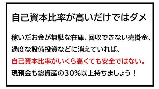 自己資本比率を高めること自体を目的にすべきではないですが、自己資本比率を高めるような経営を目指していけば、結果的に会社は安定した財務体質になっていきます。