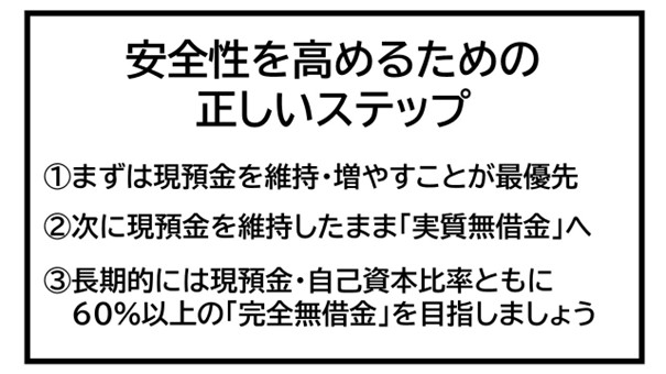 自己資本比率は最終的に60%以上を目指すべきですが、前章で述べたように、自己資本比率がいくら高くても現預金が少なければ安全とは言えません。