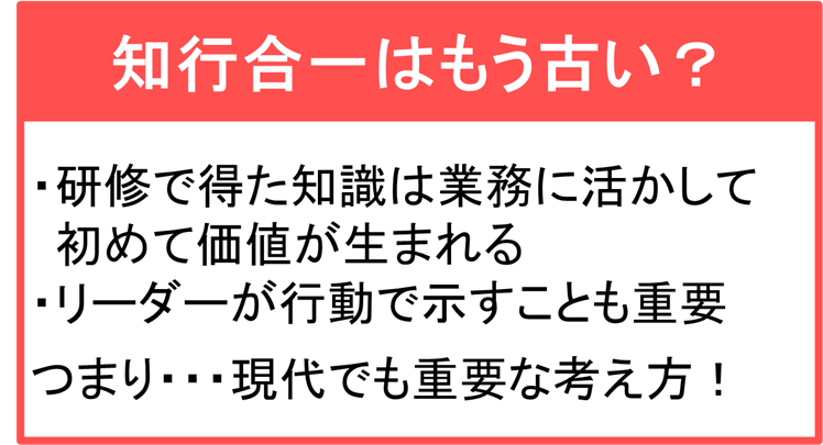 特に会社からの外部研修で受講する場合は、知識が行動に結びつかず、形骸化する例は少なくありません。これは、組織レベルでの「知行合一」が機能していない証拠です。