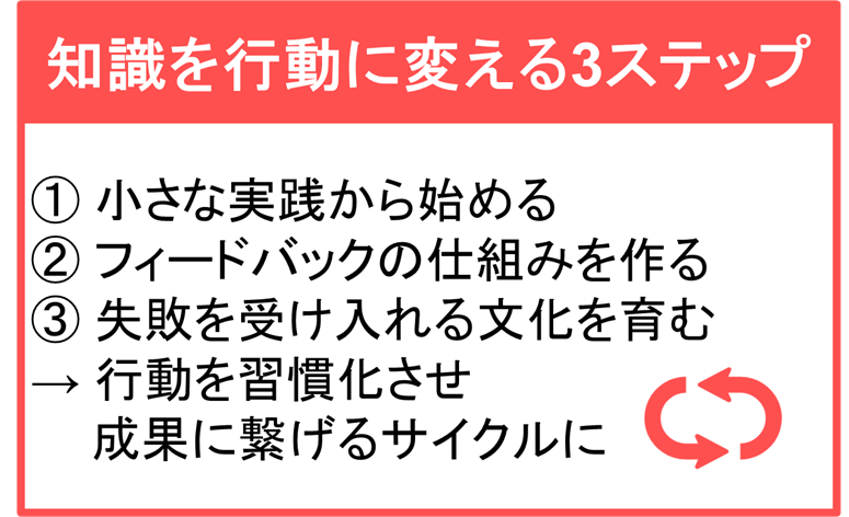 小さな成功体験を積み重ねることで、自信がつき、次第に行動の幅も広がっていきます。大きな変化を一度に求めるのではなく、 「まずはやってみる」というマインドセット を持つことが、知識を行動に変えるための第一歩です。