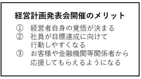 また、お客様や金融機関の方々を呼ぶことで、対外的にも経営方針や数値目標を打ち出すことになり、会社の本気度を感じてもらうことができると同時に支援を得やすくなる効果もあります。