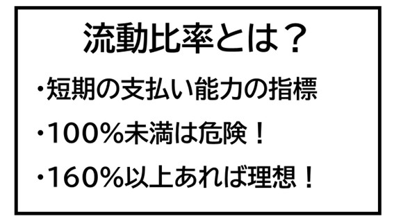 流動比率が100%未満であれば危険、160%以上あるようであれば、短期の安全性は満点の評価だと考えて良いでしょう。