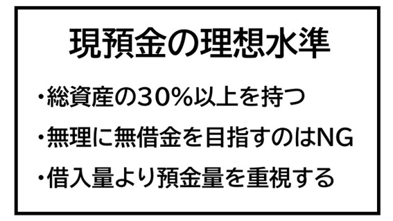 現預金が総資産の30%を大きく下回るようであれば、早めに借入をしましょう。現預金が少なくなりすぎてからでは金融機関も融資に躊躇してしまいます。