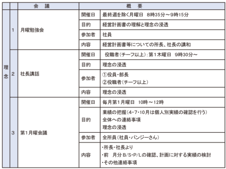理念浸透を目的として以下の勉強会・会議を行っています。