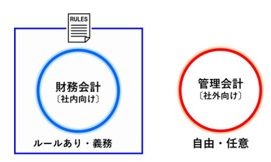 この2つの決定的な違いは、財務会計は法律、会計制度、会計基準など従わなければいけない、すべての企業に対して同一に適用されるルールが存在するのに対し、管理会計には手法はいくつかあるものの、明確に定められたルールがないということです。