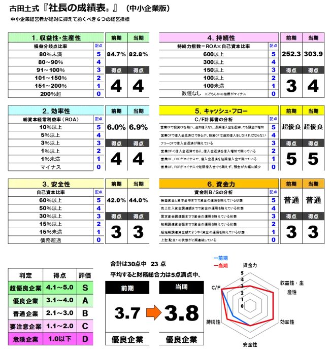 古田土会計グループでは、毎年4,000社の顧問先に、決算確定後に「社長の成績表 中小企業版」というオリジナルの財務分析資料を提供しています。この資料は中小企業が経営の目安とすべき指標を6項目だけに絞った形で構成されていますが、効率性の指標としてROAを採用しています。