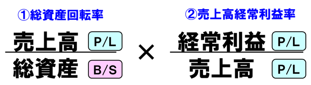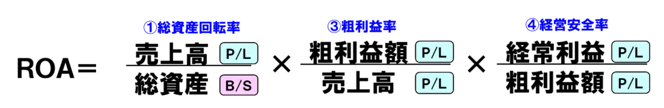 まとめると、ROAは①「総資産回転率」×③「粗利益率」×④「経営安全率」の3つの計算式で構成されているということになります。