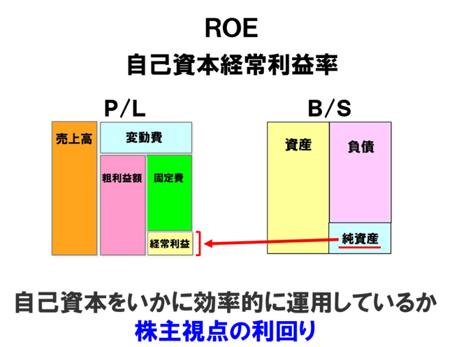 つまりROEは外部の株主からすれば、「自分たちが出資したお金でいくら稼いでくれているか」を知るための指標だということです。