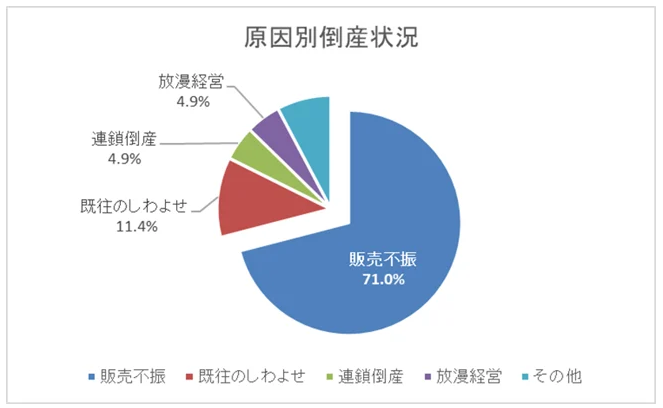 中小企業庁より発表されている、「倒産の状況」の中で、第一位に上がっている倒産要因が「売上の減少(販売不振)」です。その割合は71.0%に上ります。