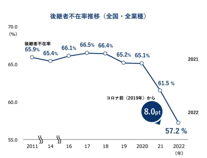 ここ10年の数値から見ると改善傾向にありますが、休廃業・解散数も年間5万社以上、倒産件数は8,500社ほどあり、一概に後継者問題が解決されたから率が下がった訳ではないことがわかります。特に新型コロナウイルスの影響があった2020年以降、急激に不在率が下がっていることを踏まえると、実態としてはさほど変化がないのではないかと推測されます。