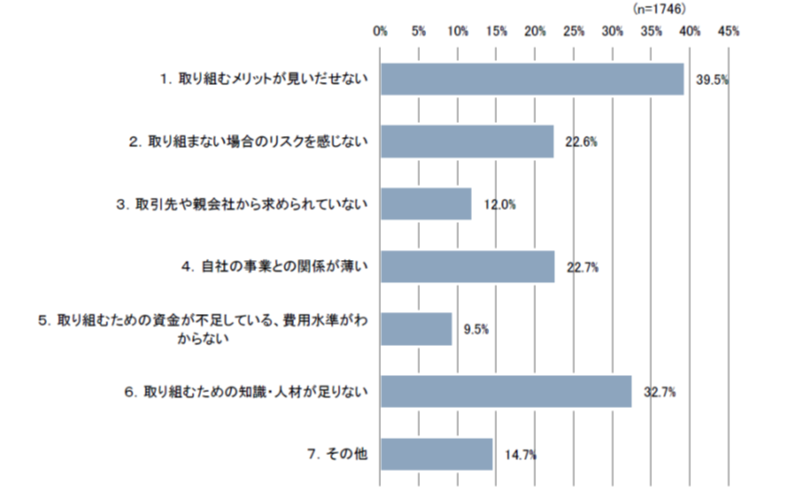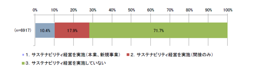 中小企業における実施状況は、本業や新規事業等に直接取り入れている企業と全社的な節水・節電・ペーパーレス等間接的に取り入れている企業も含めて3割弱といったところであり、まだまだ浸透しているとは言い難い状況であることが伺えます。