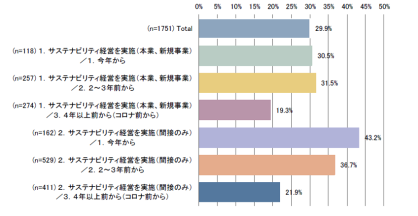 サスティナビリティ経営に詳しい人材が不足していることが課題と回答した企業のサスティナビリティ経営の実施状況(サスティナビリティ経営開始時期別)