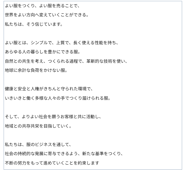 HP上で「服のチカラを、社会のチカラに。」と題し、以下の解説(約束)が記載され、「限られた資源を生かすためのさまざまなアクション」、「地域社会の平和と安定に貢献するためにユニクロができること」、