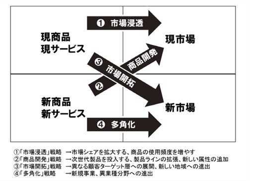 大前提として以下のアンゾフの成長マトリクスに合わせて、②新商品開発や③新市場開拓に重きを置いた新規事業を検討しましょう。