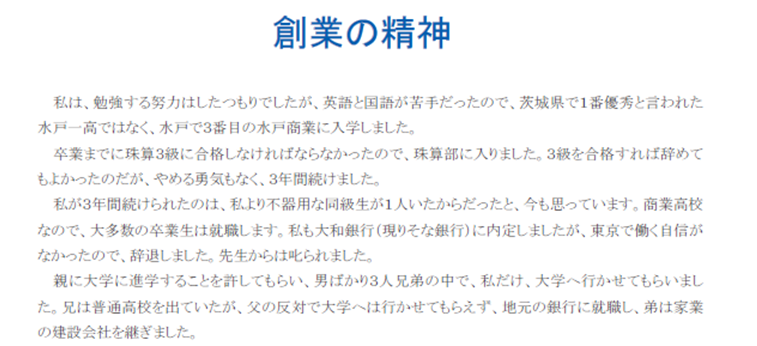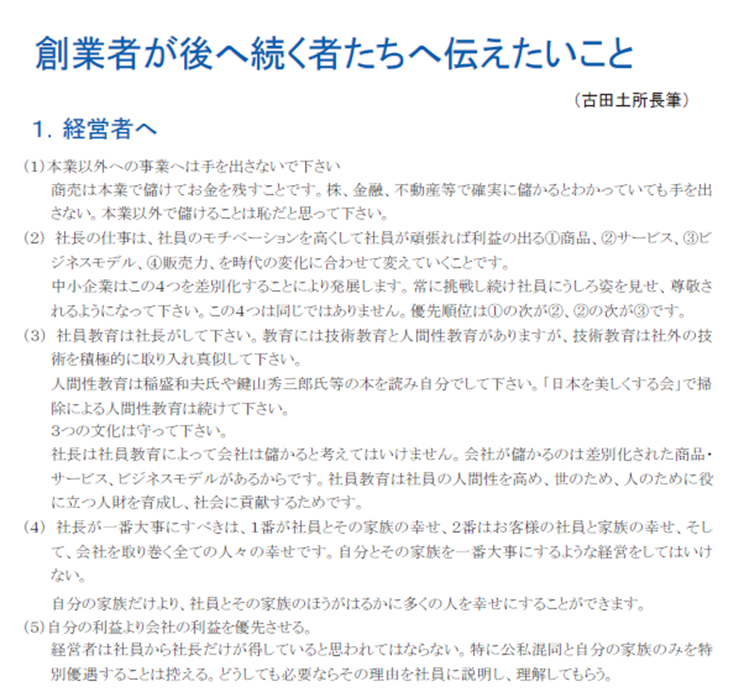 ㈱古田土経営では「創業の精神」「創業者が後へ続く者たちへ伝えたいこと」など複数の項目が次世代へ向けてのメッセージとして経営計画書に記載しております。