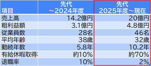 事業を承継した当時は売上14.2億円でしたが、現在は20億円。粗利益額も3.1億円から4.8億円まで伸びました。一番嬉しいのは、退職率が10%から2%にまで下がったことです。従業員数も28人から46名まで増えました。
