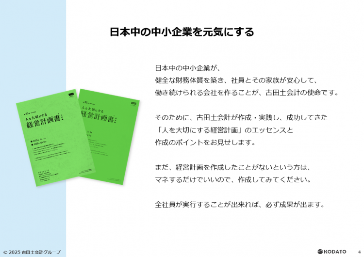 事業承継を口頭伝達のみで行うのは至難の業です。経営計画書として形に残しておくことで、次の担い手にも無理なく事業を引き継げます。